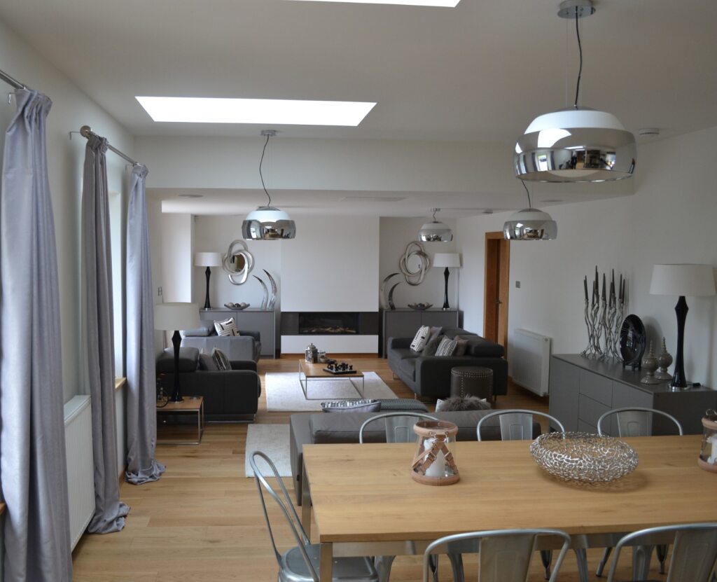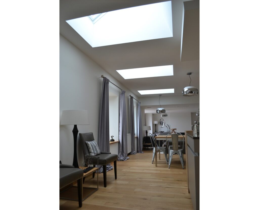 In the main open plan space high quality finishes were used for the kitchen, whilst the timber flooring and new flat ceiling helped to unify the space. The addition of four large rooflights helped to floor natural light into the space.