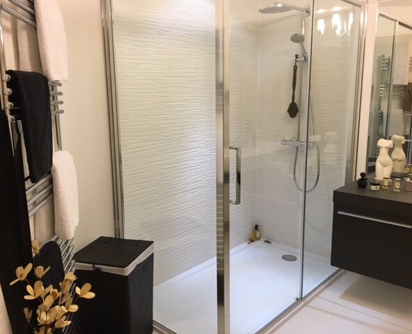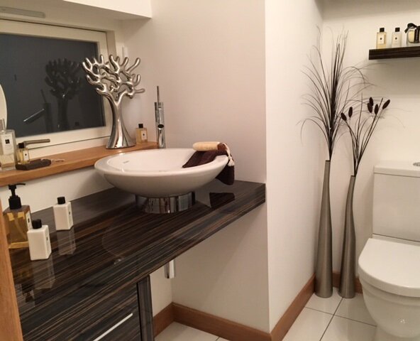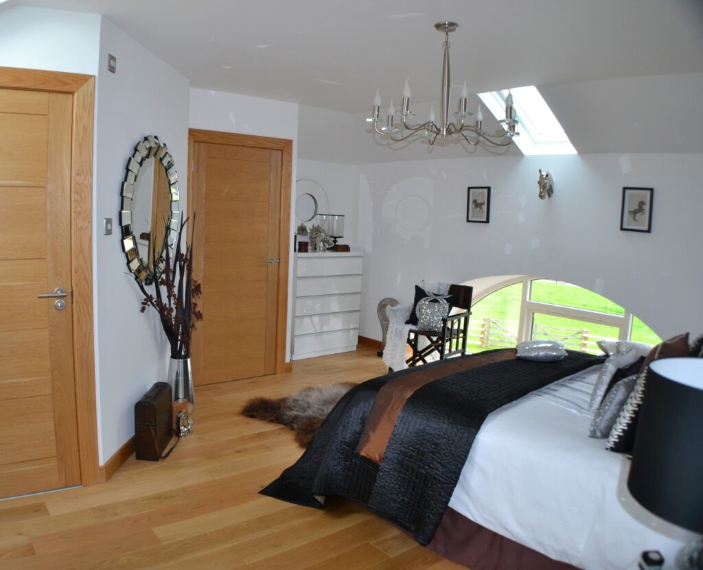 The first major design move was to divide the long thin shaped building into 2 wings: the west became an open plan living space with kitchen / dining / lounge; whilst the east became the bedroom accommodation with 4 ensuite bedrooms.