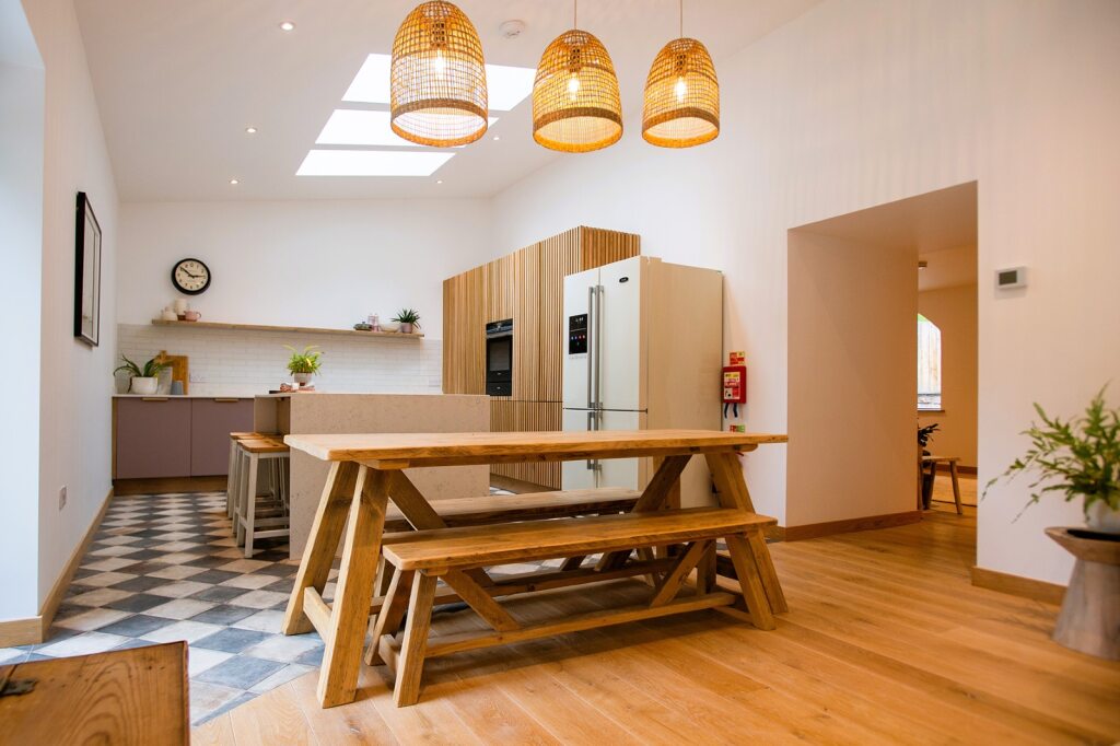 The client used local trades throughout the restoration. The new extension is finished with Siberian Larch which references nearby timber agricultural buildings but also creates a clear definition between the historic existing building and the new modern addition.