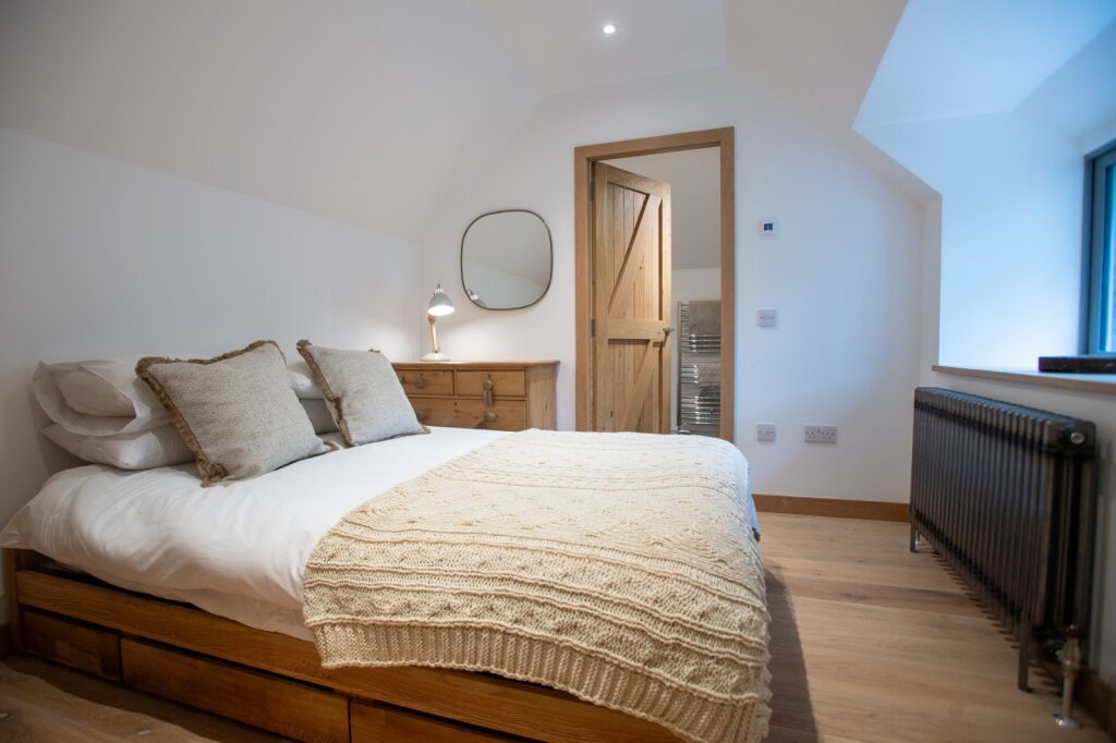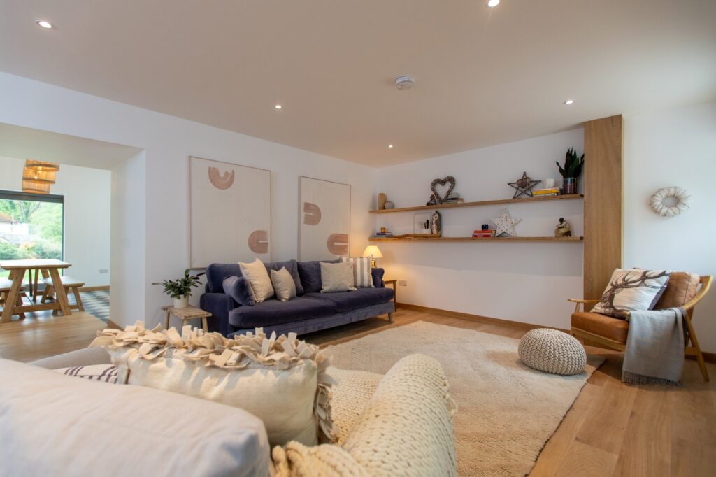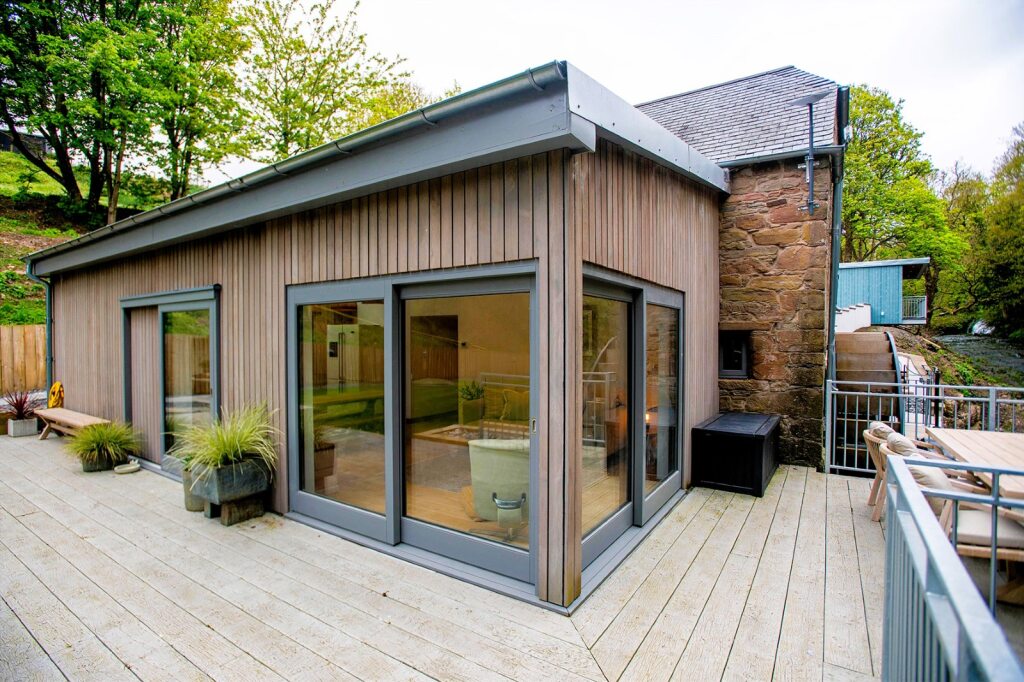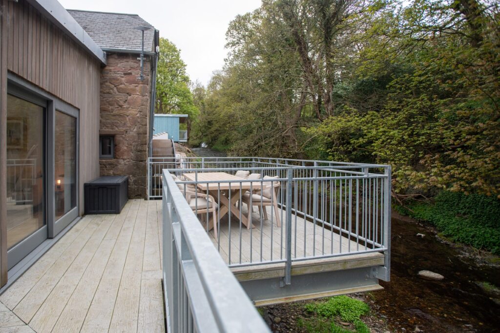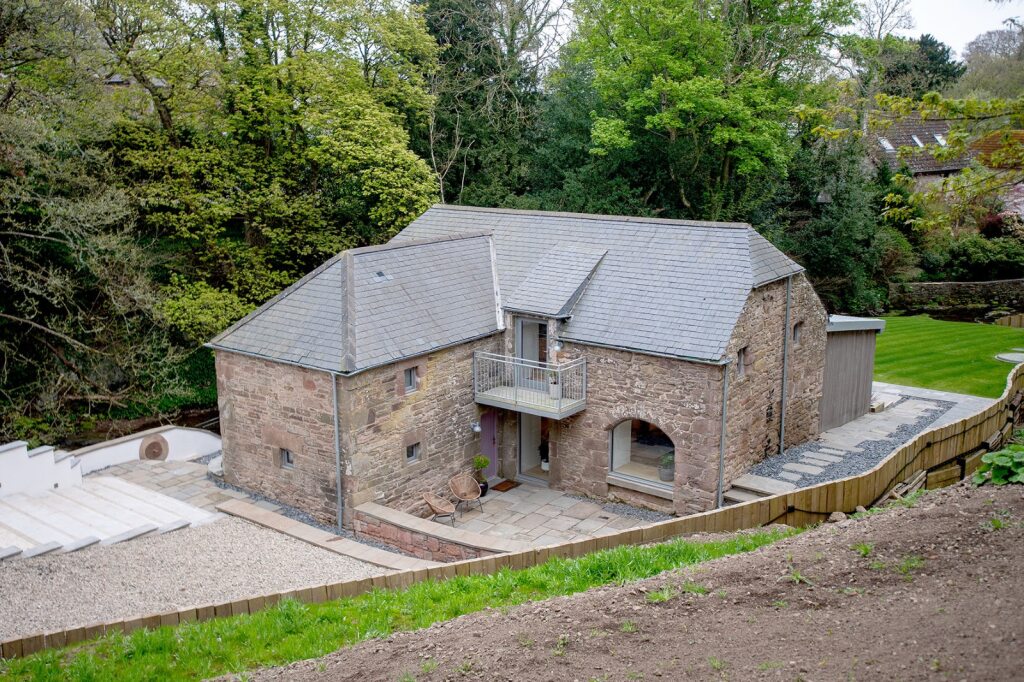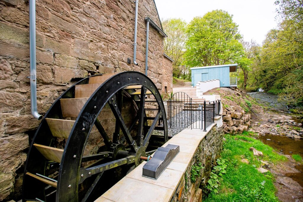 The stonework and roof were extensively and sensitively restored, and a special feature was the refurbished working waterwheel, reproduced by a local Blacksmith and now a key feature in the house. All the existing stone walls had a new DPC and insulation applied, and triple glazed windows were installed throughout. The new extension is highly insulated, and a new high efficient air source heat pump provides all the buildings heating needs.