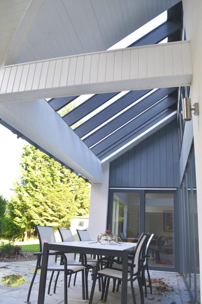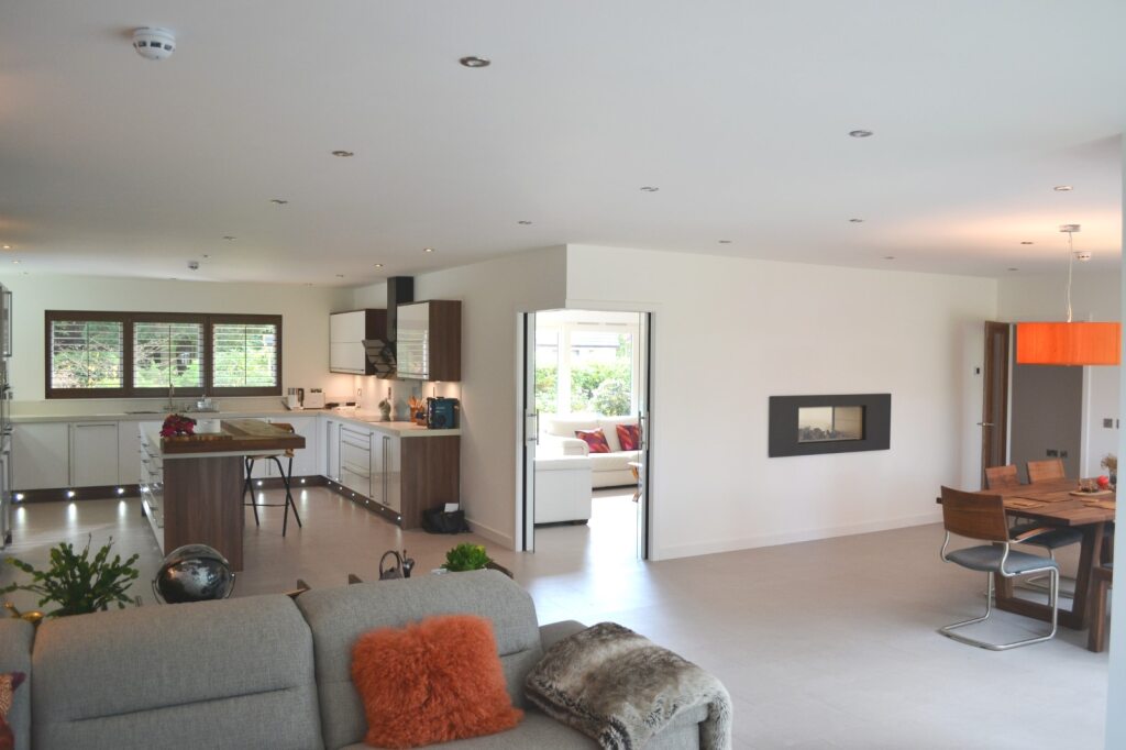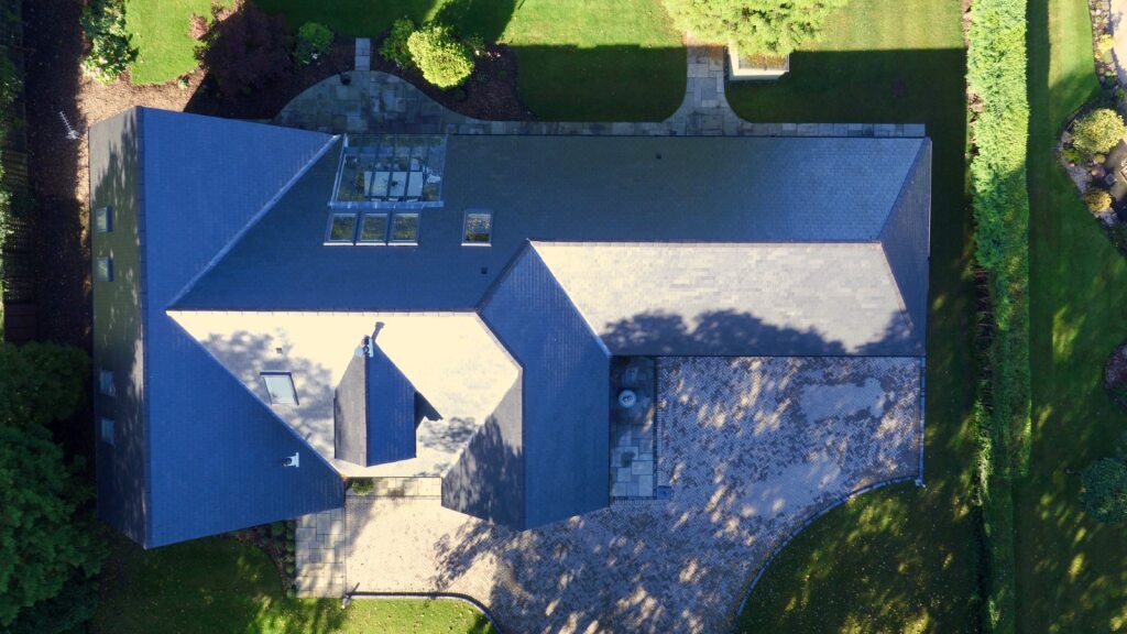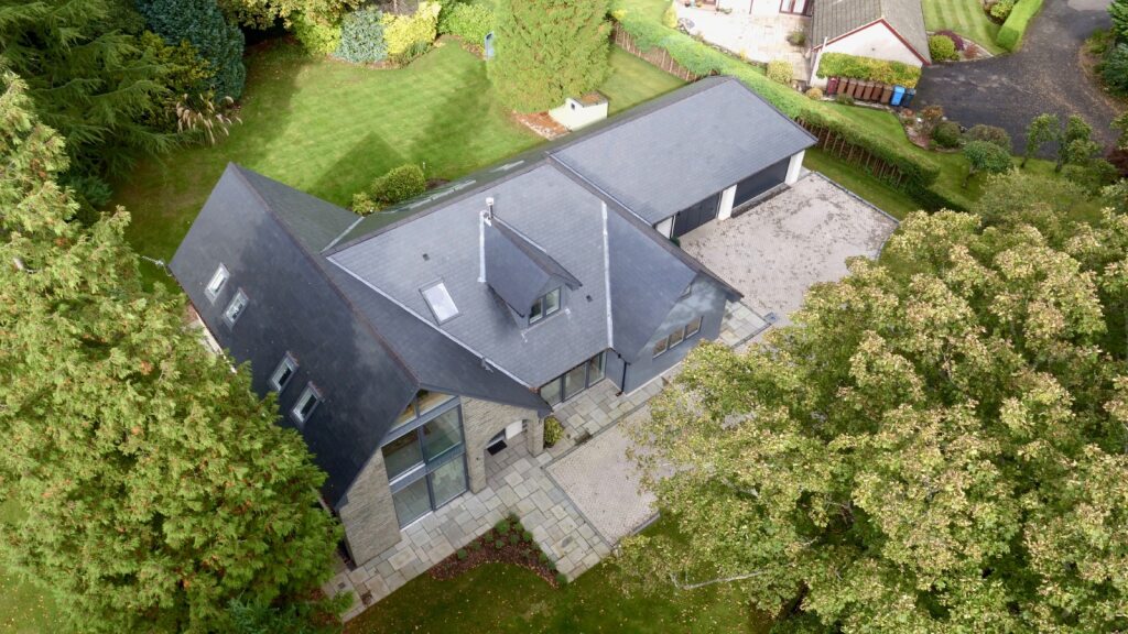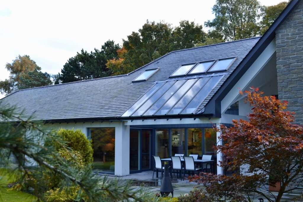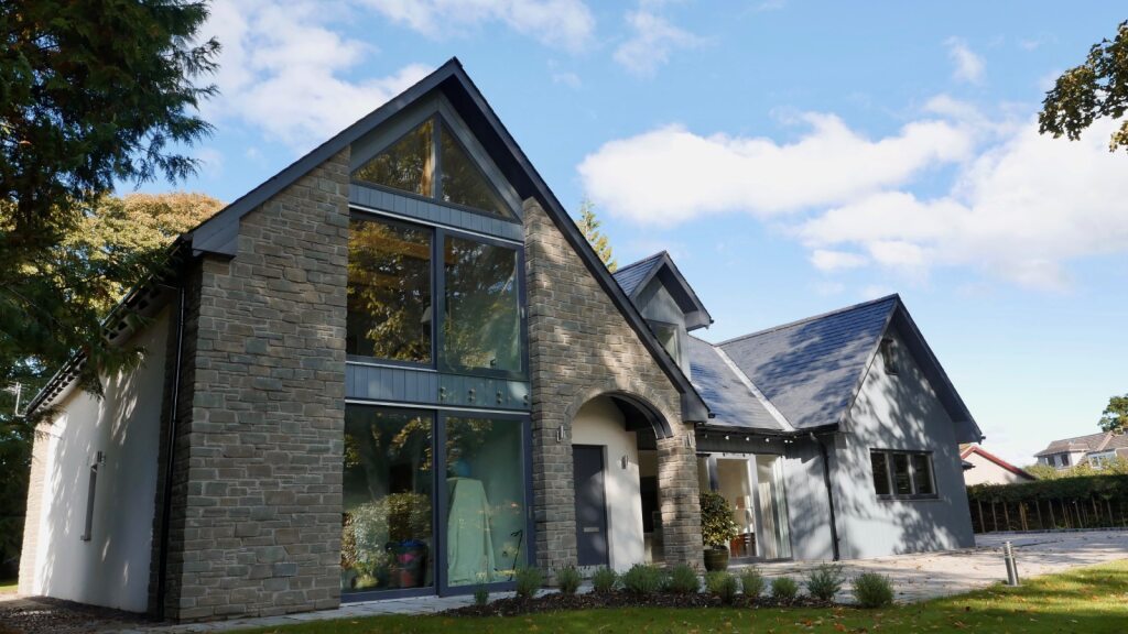 Externally the house is traditional in character and appearance with natural finishes to compliment the design: natural slate pitched roof and dormer window, stone cladding, white render and dark grey vertical lining, with clean, modern internal finishes.