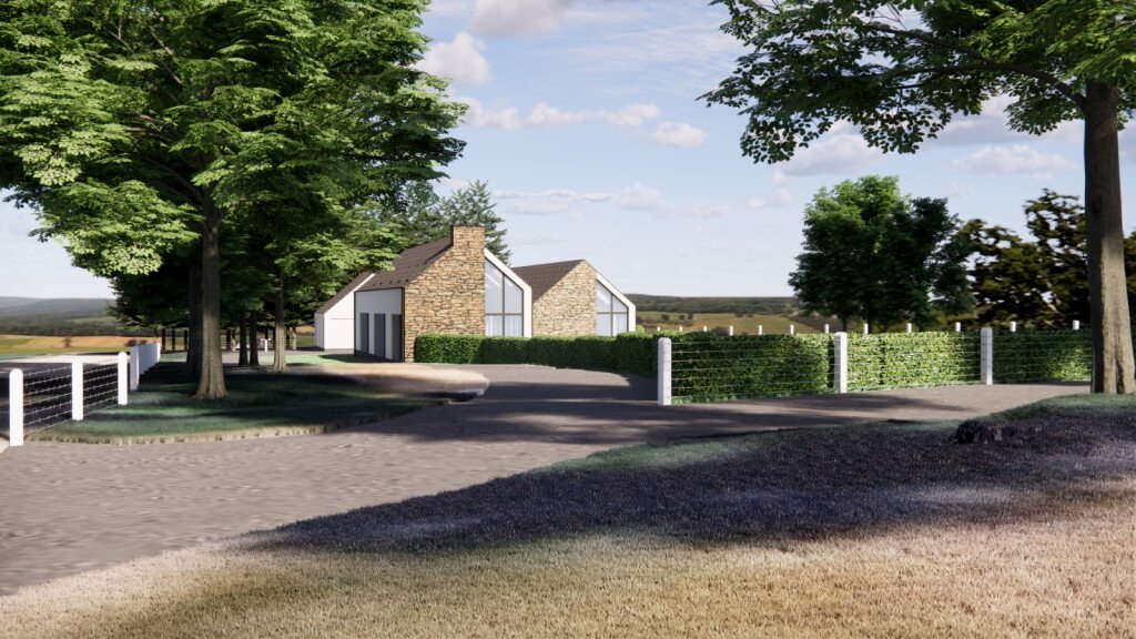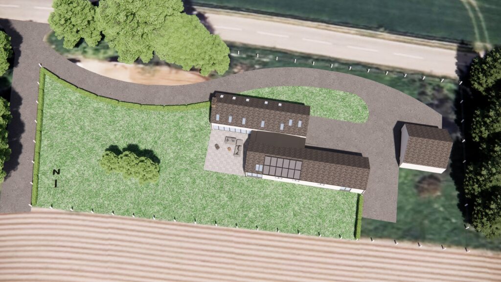 An existing access at the North-West corner was re-used to facilitate the access to the new house and existing field. This creates a new curved access track to the house, and a new fence/hedge at the west will define and separate the house plot from the field access track.