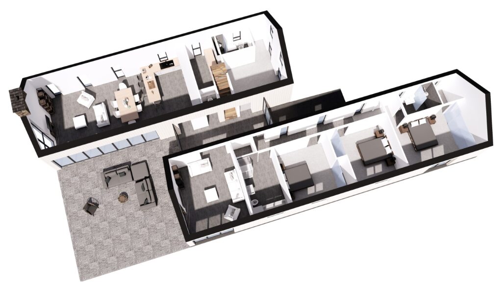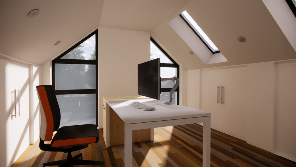 The southern section contains a separate lounge space (with another door connecting to the patio), a public bathroom and 3no. further bedrooms. The Third bedroom at the end is a master suite with ensuite dressing area and large wardrobe wall. The Northern wing has also been raised in height slightly (approx. 0.5m) to allow for a small private office space to be located at the East (above the Ground Floor Guest bedroom).