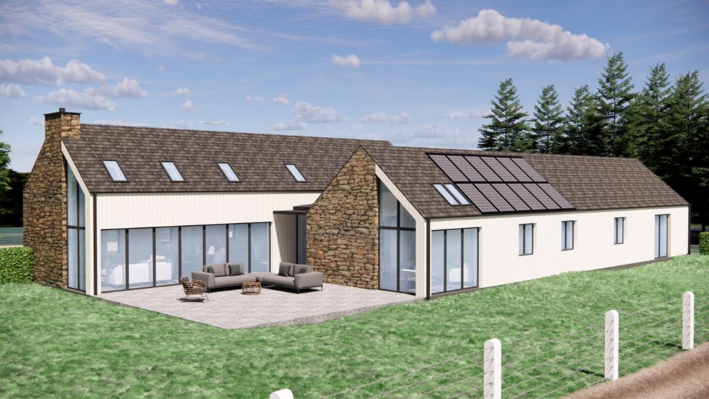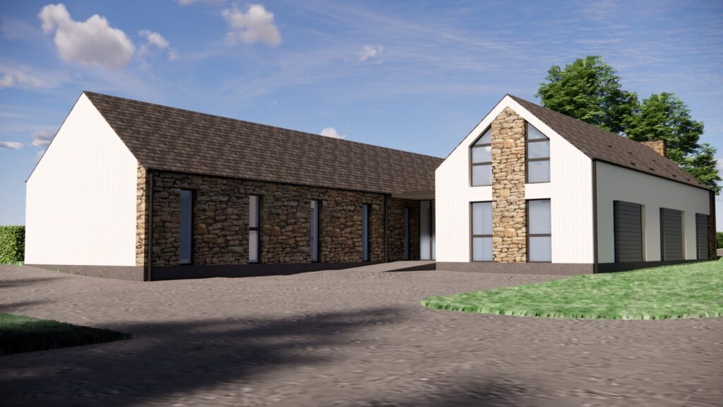The proposal contains a mix of natural and contemporary materials with Timber effect weatherboard (Chalk White and Grey sections of infill on the North Elevation), Natural stone and a dark grey slate effect concrete roof tile. This forms a neutral palette of materials and colours that will fit well in the Angus Countryside and locality. The sections of stone are located predominantly at the West and North Elevations, to reflect the key areas on approach to the building and main entrance. The tall angled windows on the West Elevation compliment the adjacent stonework and create an attractive approach to the building.