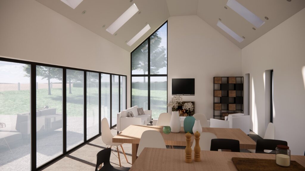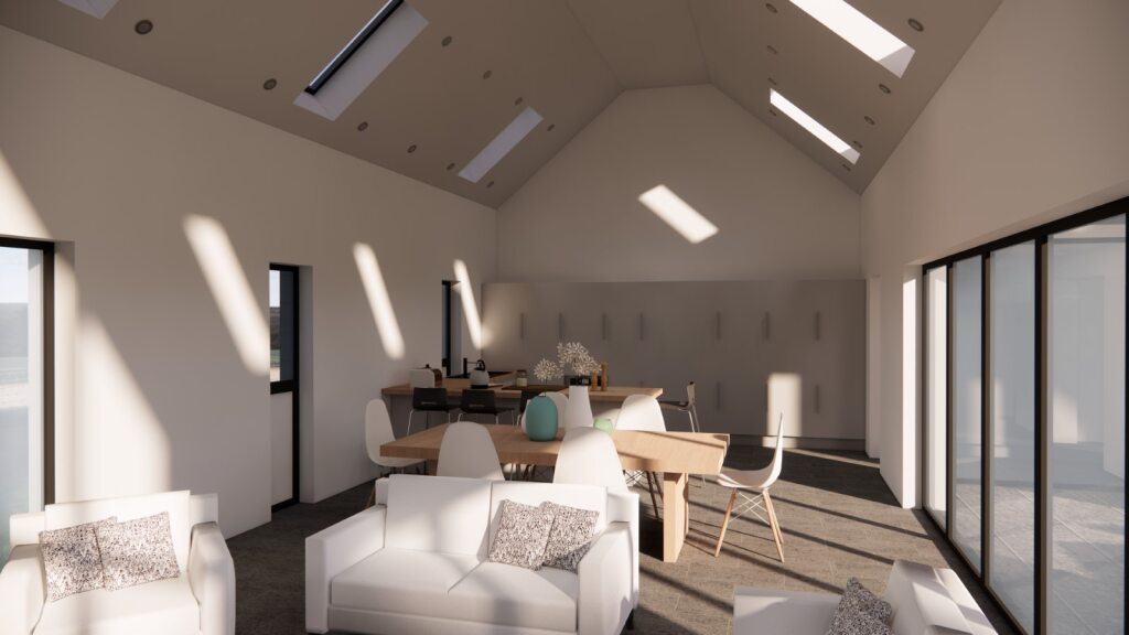 The Northern Wing contains a large open plan kitchen/dining/living space, utility room, WC and Guest ensuite bedroom. The main living area has a vaulted ceiling to make the space feel much taller and grander, with a series of rooflights on either side to bring lots of natural light into the space. A large window opening links the open plan space to the patio and garden at the south, with bi-folding doors allowing a large section to open up to the patio.