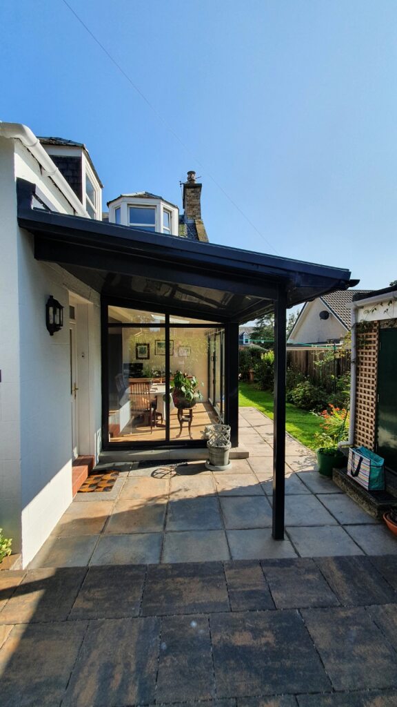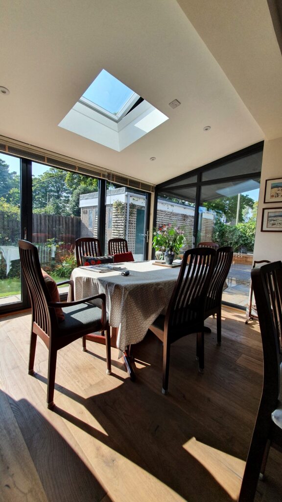 A sleek low profile standing seam metal roof was created to overhang and protect the entrance, whilst continuing over the extended dining space. A large glass corner window provided a view into the inside from the door whilst letting lots of natural light into the space. A simple single rooflight carefully positioned over the new metal roof also let light back into the kitchen space.