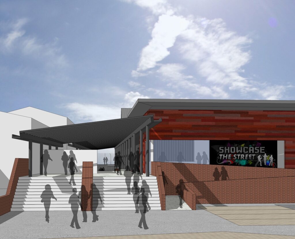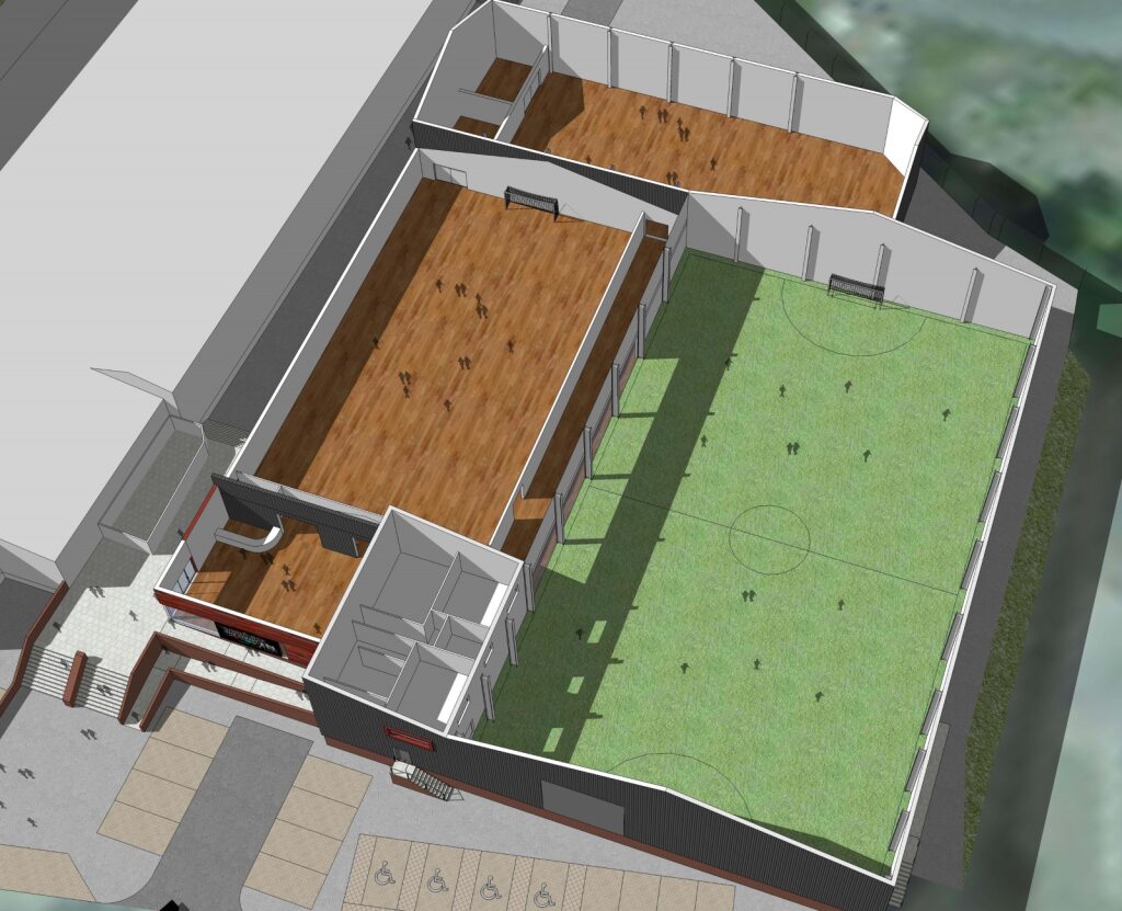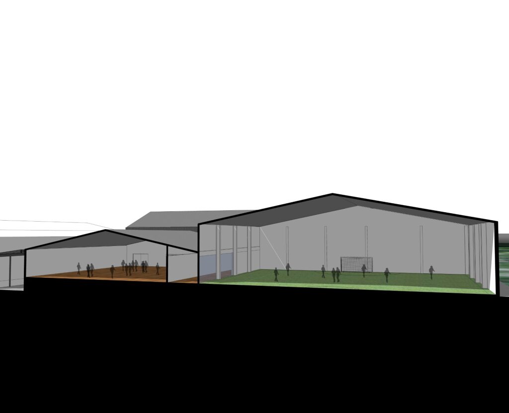 The buildings will receive a much needed facelift and the building fabric insulated to current standards. Internally the surfaces will be state of the art including a 7-a-side 3G playing field. A new modern entrance has been created with a glass canopy housing the main entrance/café/reception functions.