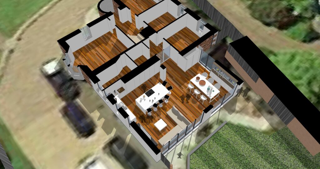 Visually the new extension is simple and sympathetic to the existing listed building, and takes the form of a shallow pitched roof with extensive glazing at the North side. This allows for views and access to the private garden at the back of the house. New bifold doors will create further connection to the outside allowing the new space to be ‘opened up’ to the garden. A large roof lantern is positioned centrally above the dining area to let lots of light flood into this space.