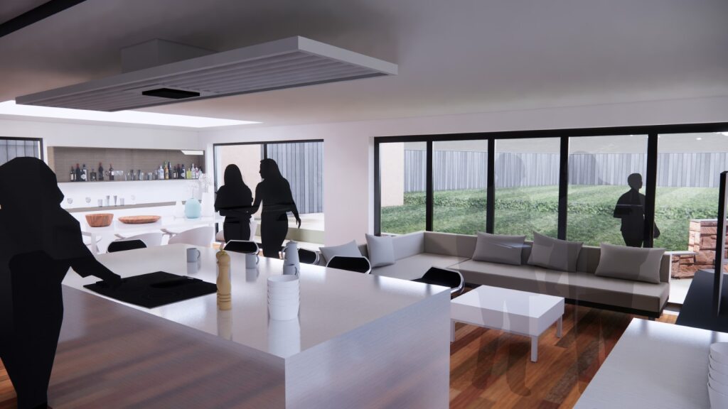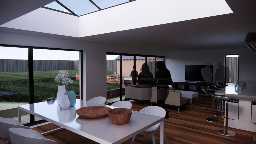 The new wall finish is a white render, which will be extended to the existing house.