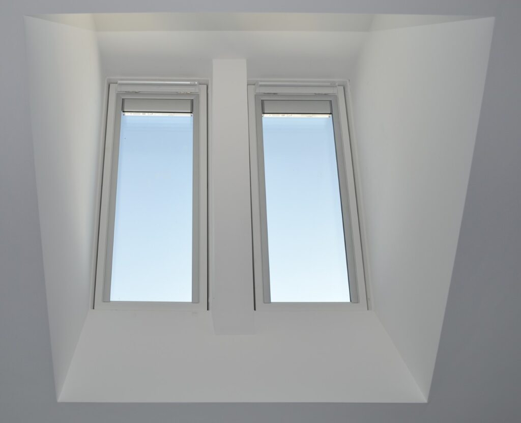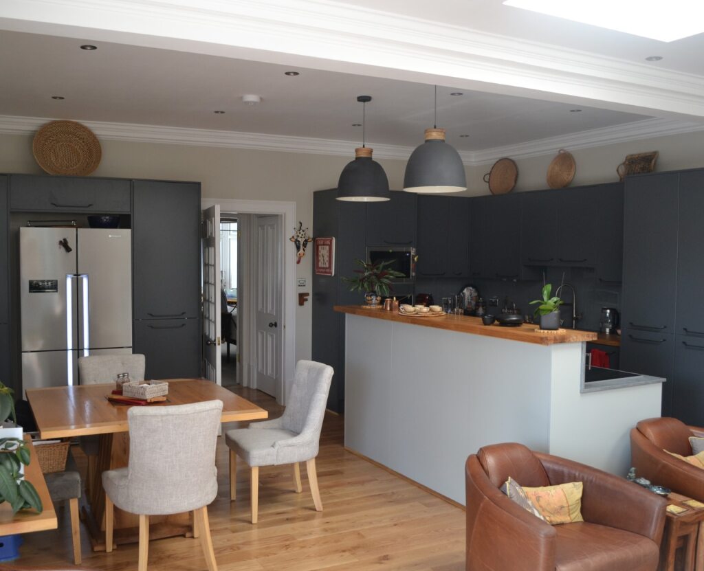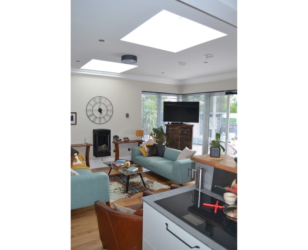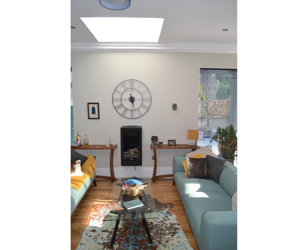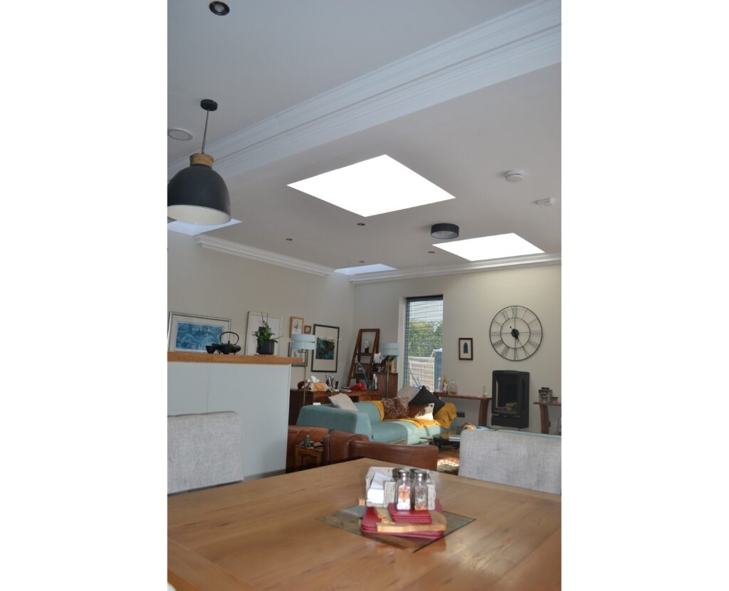 The proposal creates a new open plan kitchen dining living space with large french doors, and carefully positioned rooflights which let natural light deep into the plan. A glazed canopy acts as a further outdoor/indoor space.