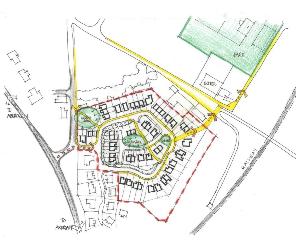 To allow the site to be accessible and permeable, public routes were created around the existing road network, and through the central section of the site. Connections were made outside the site via a new access from the north-west corner to Inverkeilor main street; and to the east a new access would be created along the side of the Village hall connecting the site to the hall, houses, school and park/playing fields.
