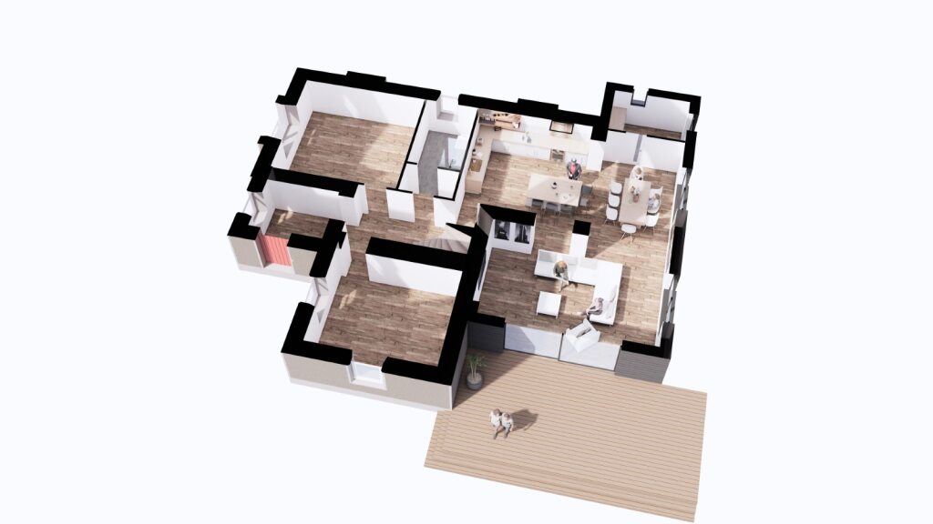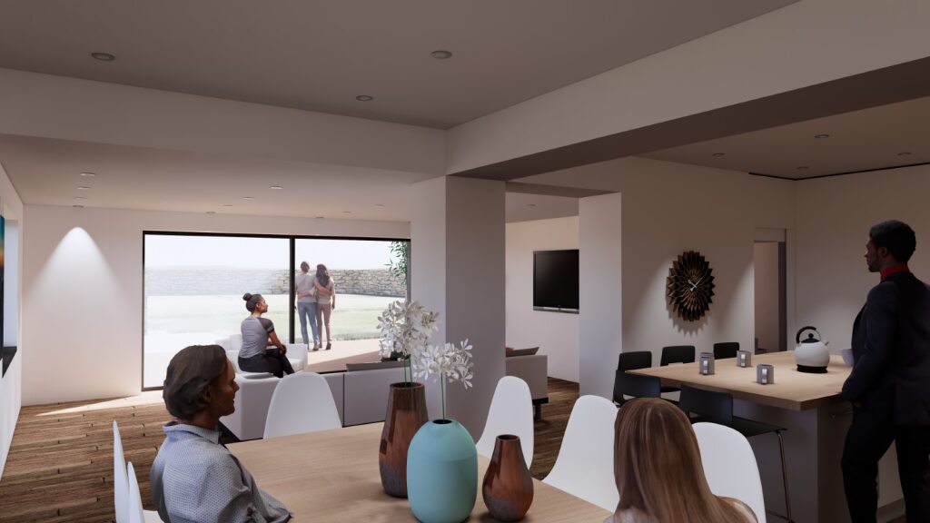At ground floor level the existing entrance, hallway, lounge and dining rooms spaces are retained. The lean to garage and bathroom at the east are demolished to make space for a new extension that wraps around the East of the building. The entire east wall of the kitchen will be opened up to allow the kitchen to be an open plan space, with the dining and living spaces placed at the east within the new extension block. The new spaces will enjoy the sea views to the east, whilst connecting to the garden via a large window at the South Elevation that slides open to a new external south-facing patio space beside the garden.