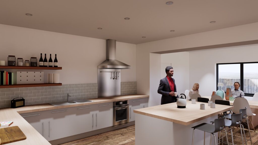 An existing column is retained at the corner of the kitchen to assist structurally and also to define the kitchen space. A small utility room is located at the North-East corner to create a ‘wet’ back entrance to the house from the Northern garden space. A new more spacious ground floor toilet is formed off the existing store.