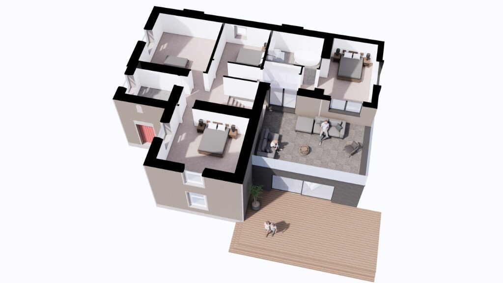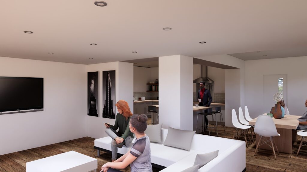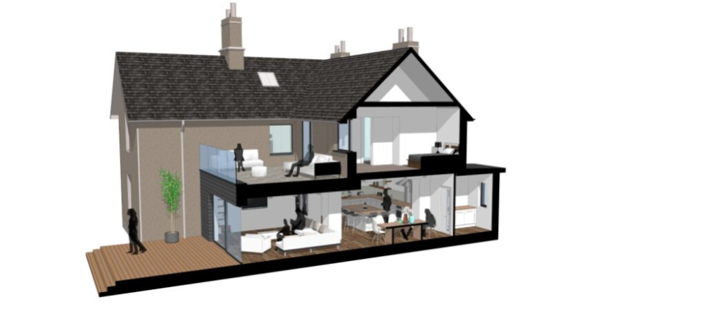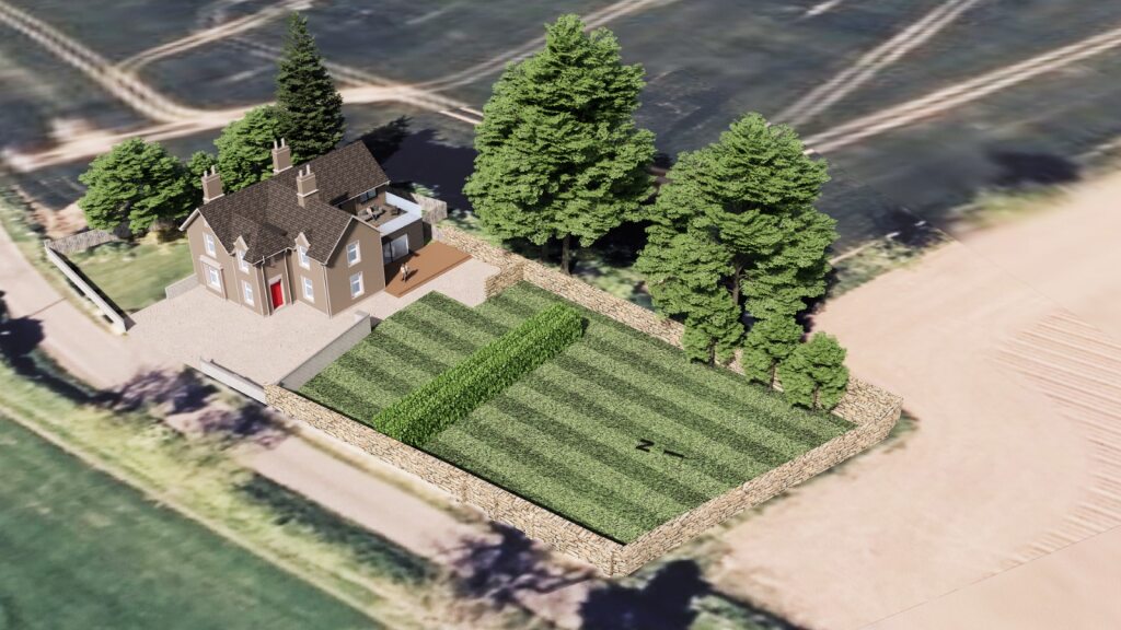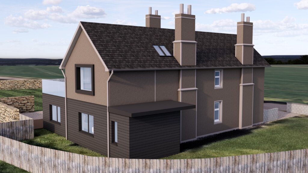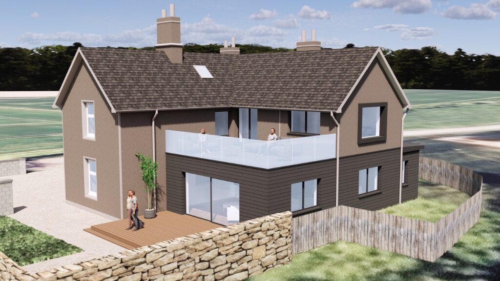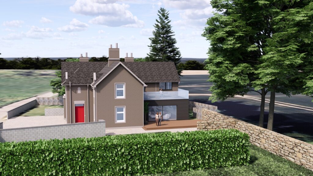 Above the living space below a generous upper floor terrace area is created to make use of the roofspace, and this will be accessed directly off the entrance into the Master bedroom to allow for a large private balcony. There are no houses anywhere near to the Manse and so the balcony and upper floor rooms will not overlook anything other than the adjacent fields.