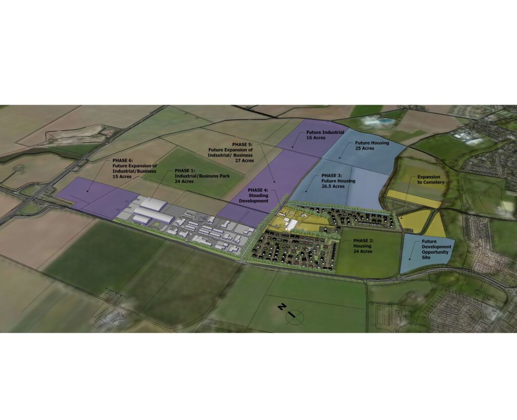 Future Phases have also been indicated for further expansion for both Housing and Industrial/Business illustrating the flexibility and potential for growth for this masterplan. The proposals also incorporate extensions to an existing cemetery.