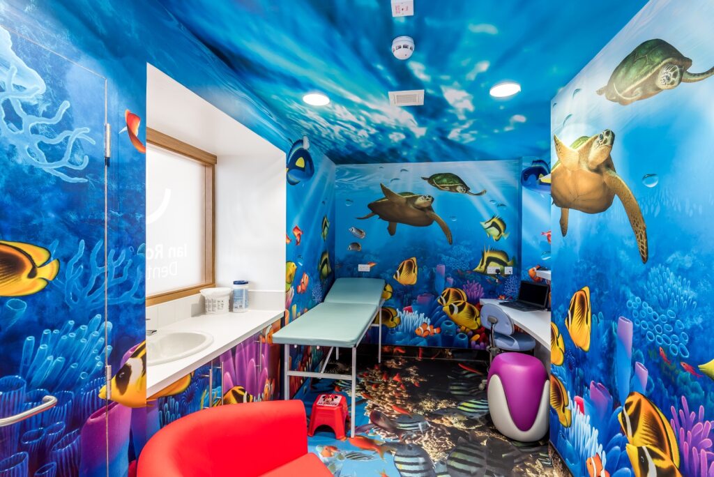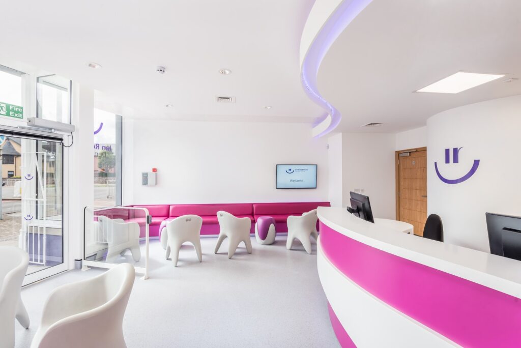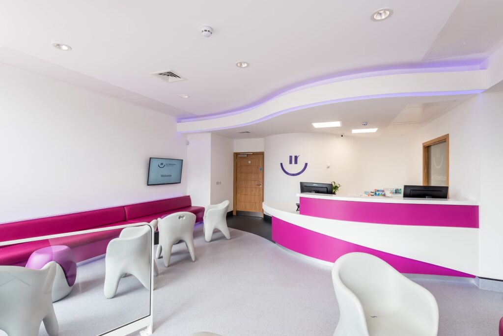 The internal finish is modern with specially chosen ‘tooth’ chairs and stools. The child smile room is a feature aquarium with coral reef flooring, water ceiling and aquatic wallpaper. We worked closely with the client and also the NHS trust to develop the design, and the result is for exciting modern alterations to an expanding local business.