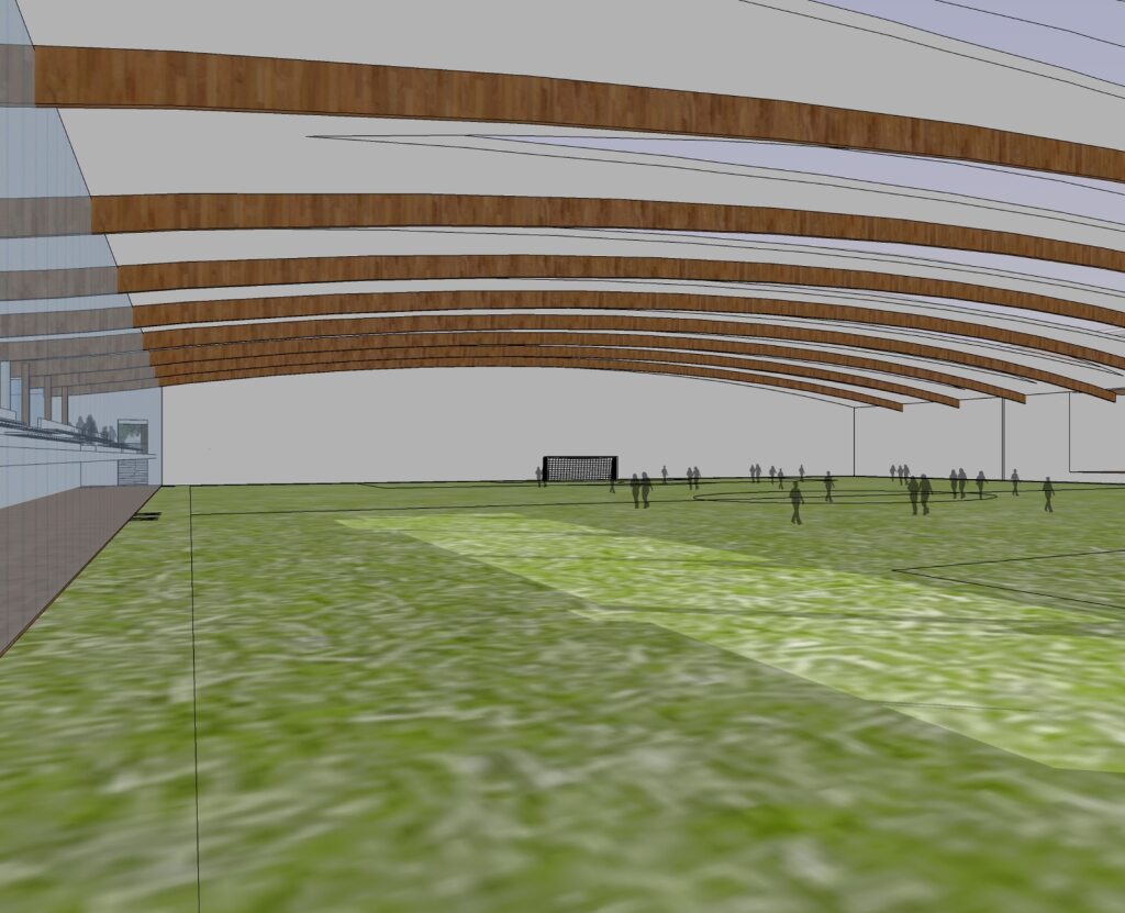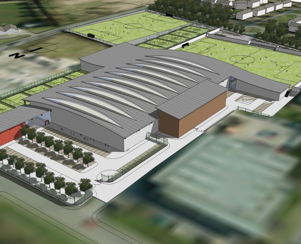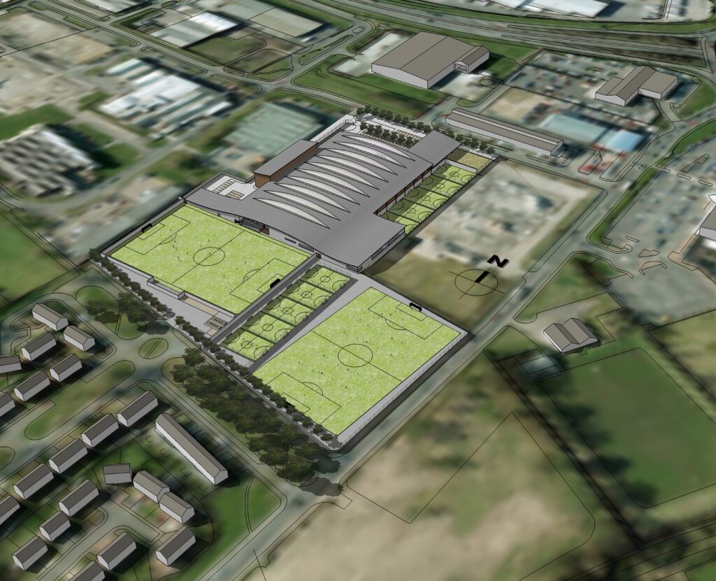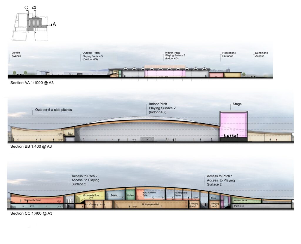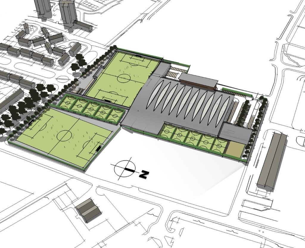 The brief was to create a large flexible sports centre for a local community partnership in Dundee incorporating a wide range of activities, including three large 4G pitches, one of which is indoors under a large curved roof and is capable of turning into a large conference space/concert venue.