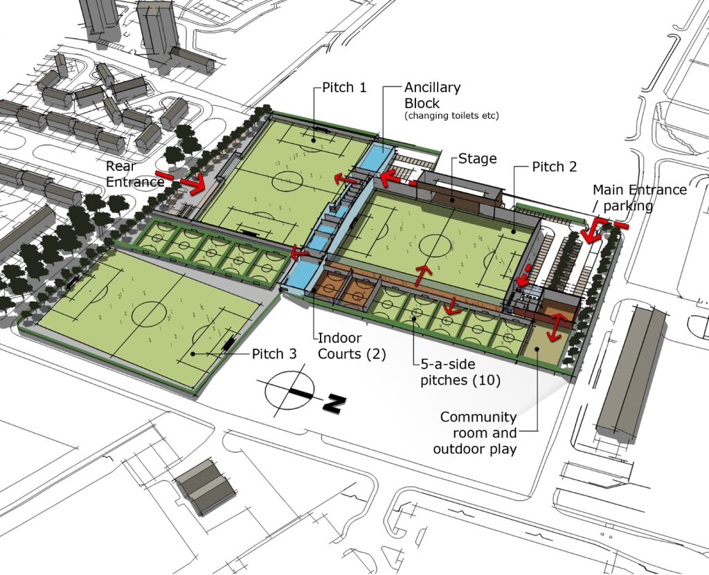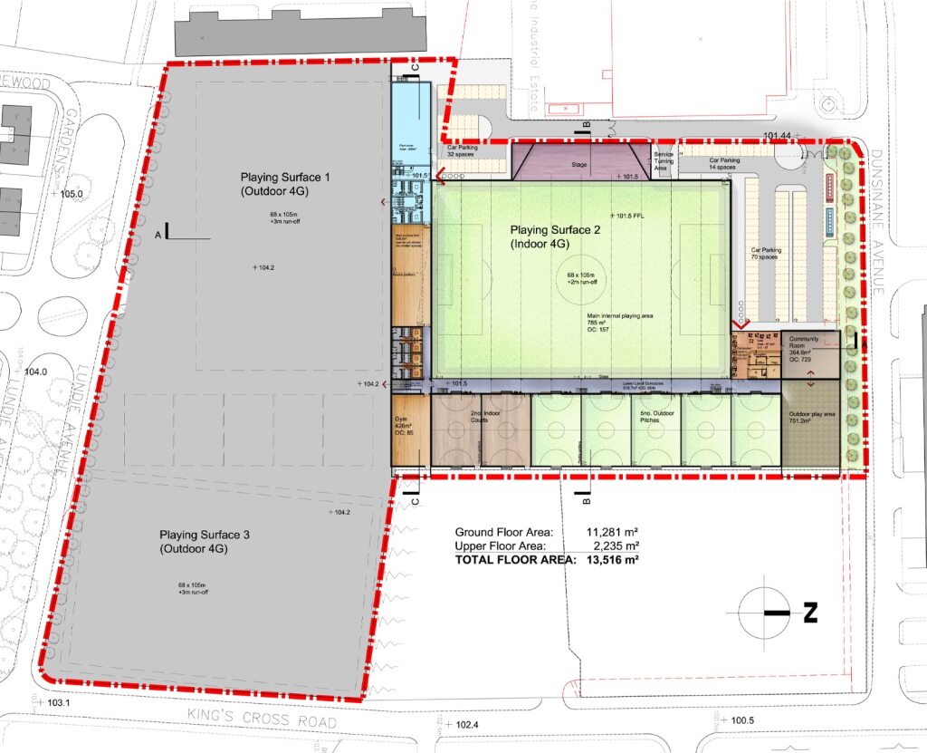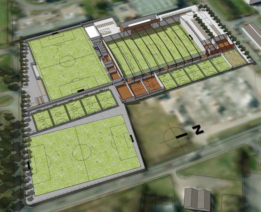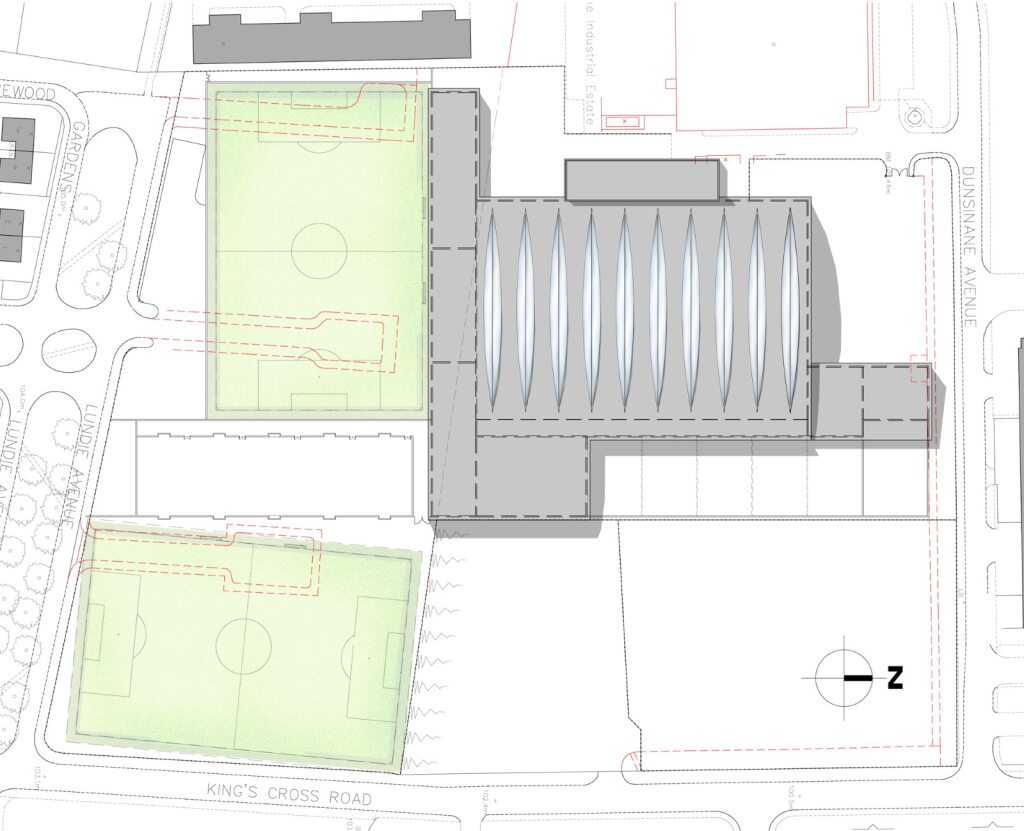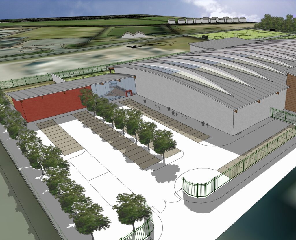 The brief was to create a large flexible sports centre for a local community partnership in Dundee incorporating a wide range of activities, including three large 4G pitches, one of which is indoors under a large curved roof and is capable of turning into a large conference space/concert venue.