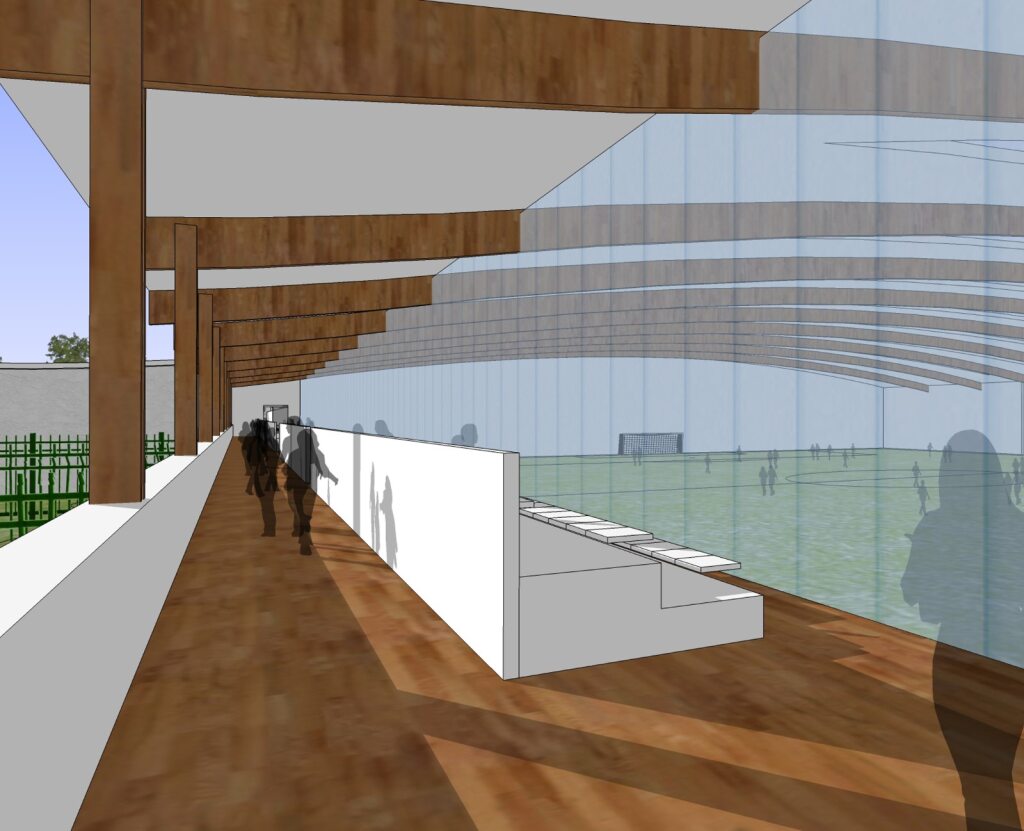 The shape and form of the building is a simple curve housing all the activities underneath, and enclosing further outdoor 5/7-a-side pitches. A community room and café help to cater for further members of the local area.