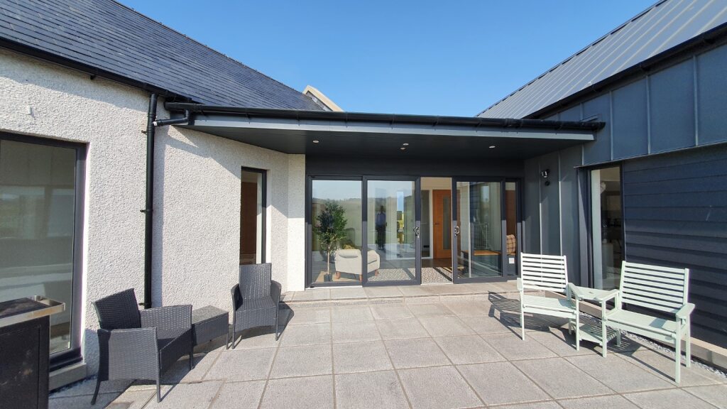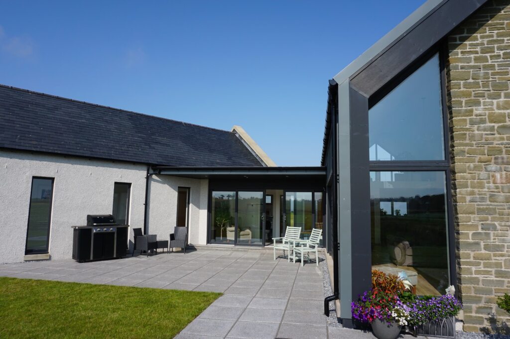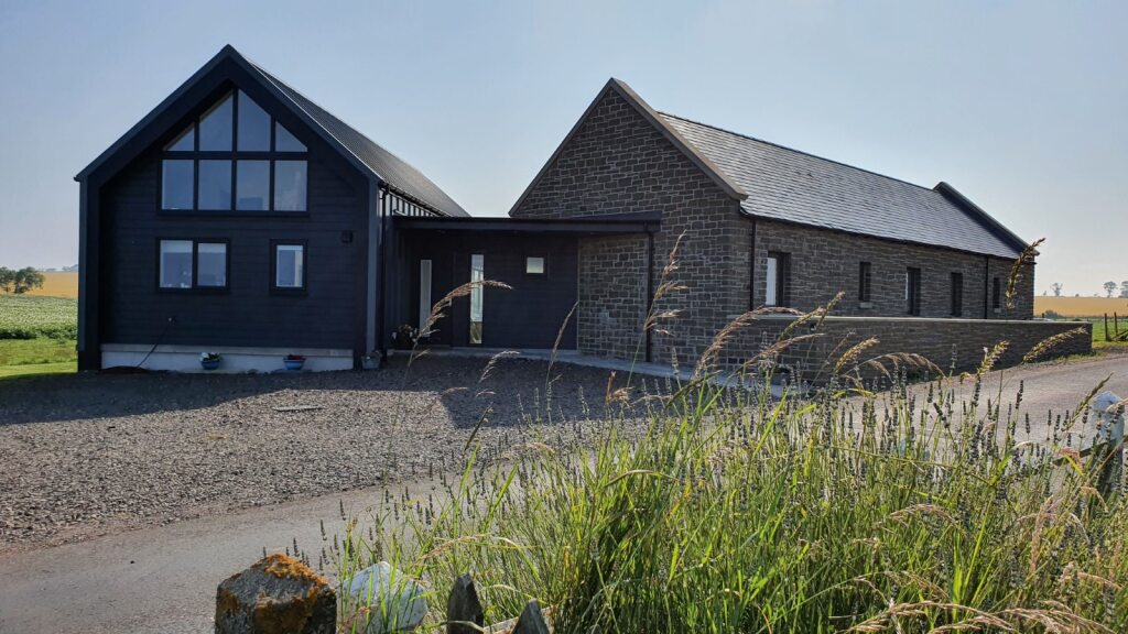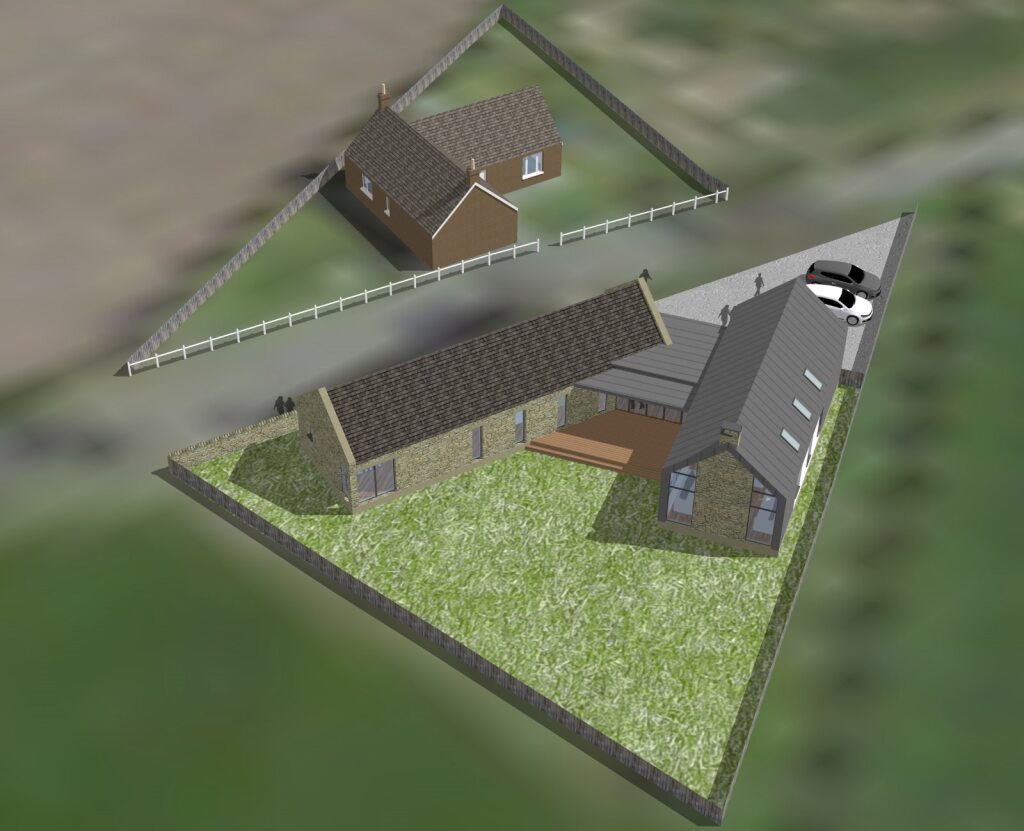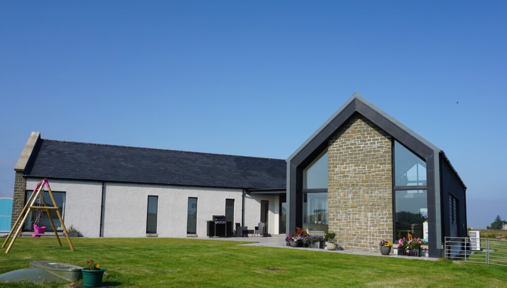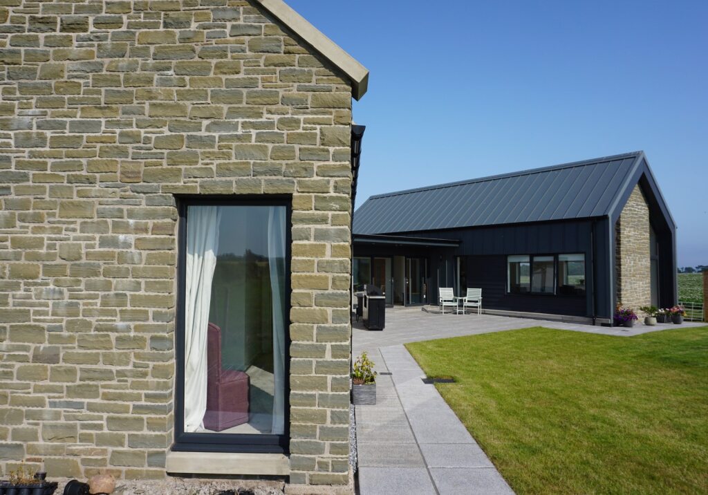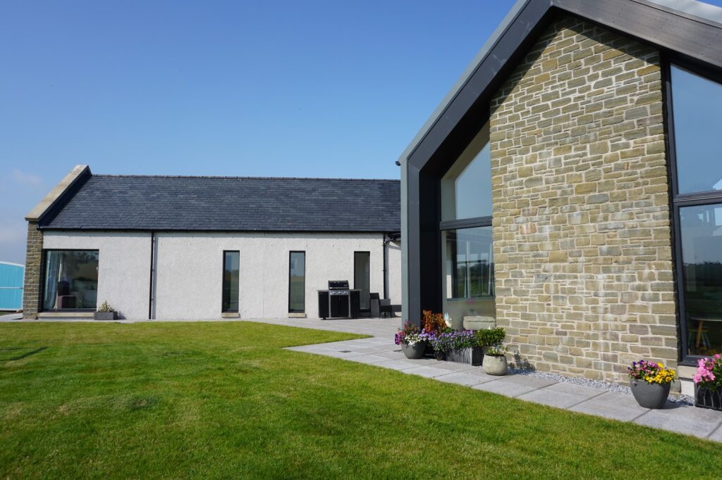 The new house is split into 2 single storey blocks: a bedroom wing at the front/road side; and a living wing at the rear. The block at the front takes the form of a traditional stone clad building, with slate roof and parapet roof detail, to reflect the historic heritage of the former building on site.