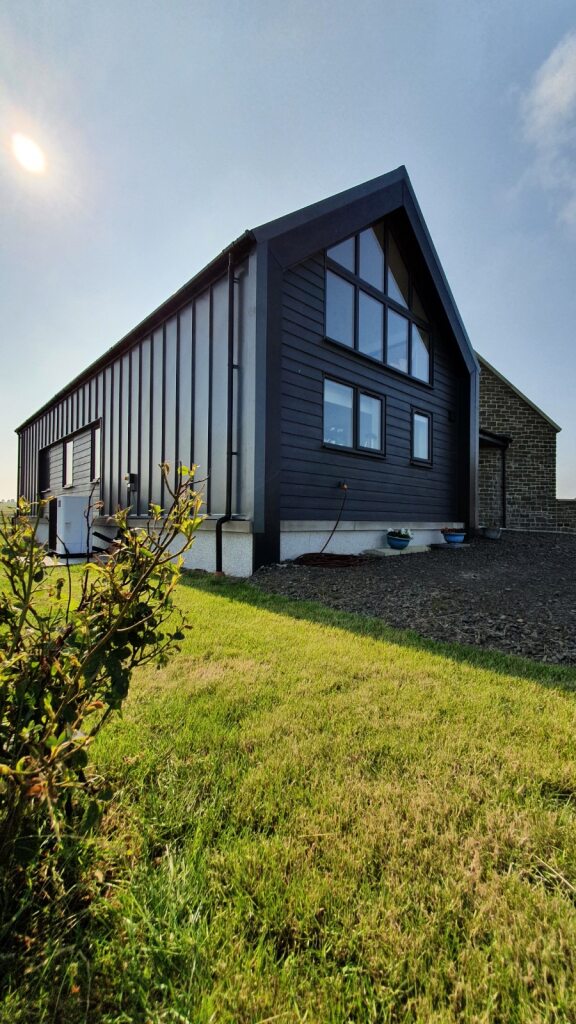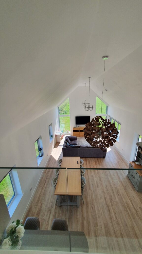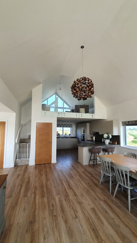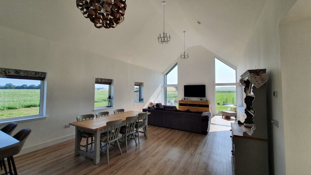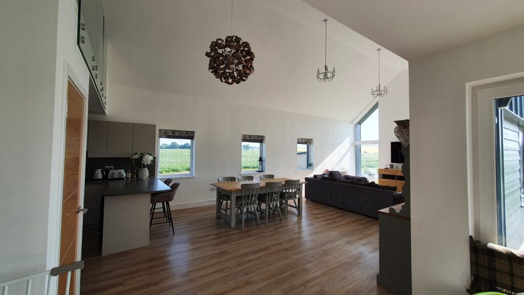 The block at the rear is clad in a modern standing seam to contrast with the traditional block at the front, containing a large open plan kitchen/dining/living space with vaulted ceiling and a mezzanine office at the rear, which enjoys views of the Sea to the East. Inside the living space the chimney has been expressed with large full height windows either side offering fabulous views to the countryside.